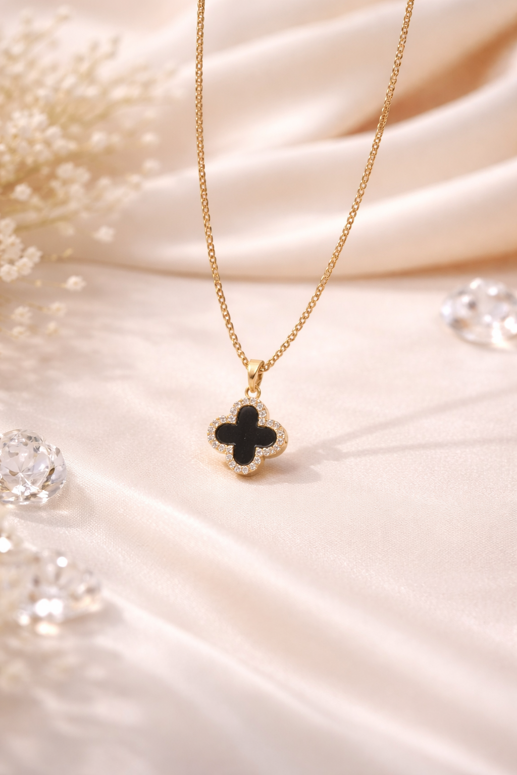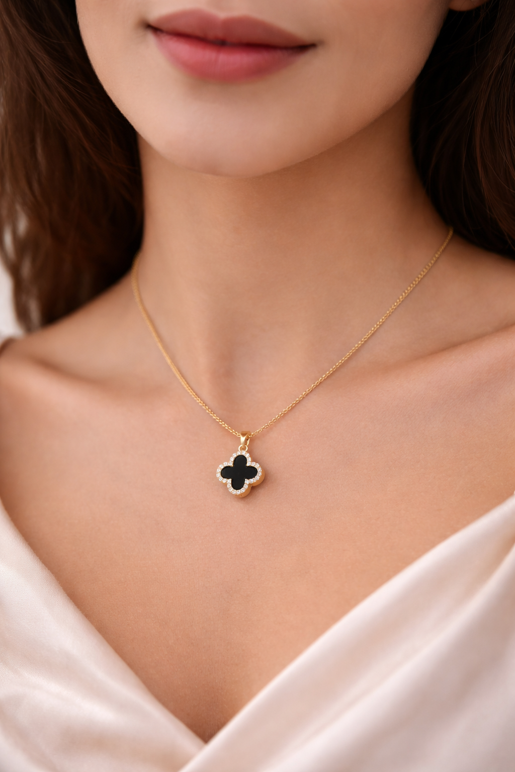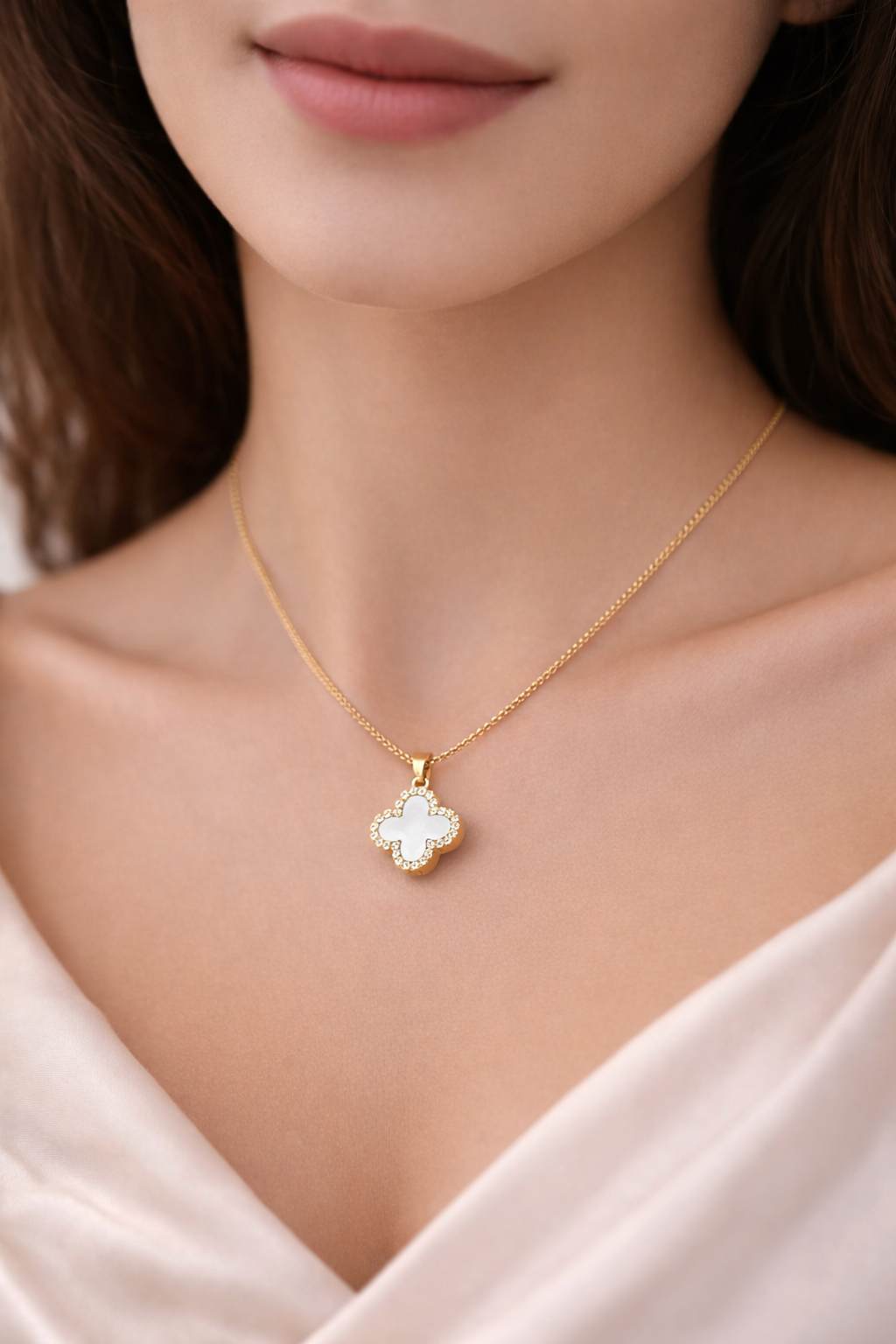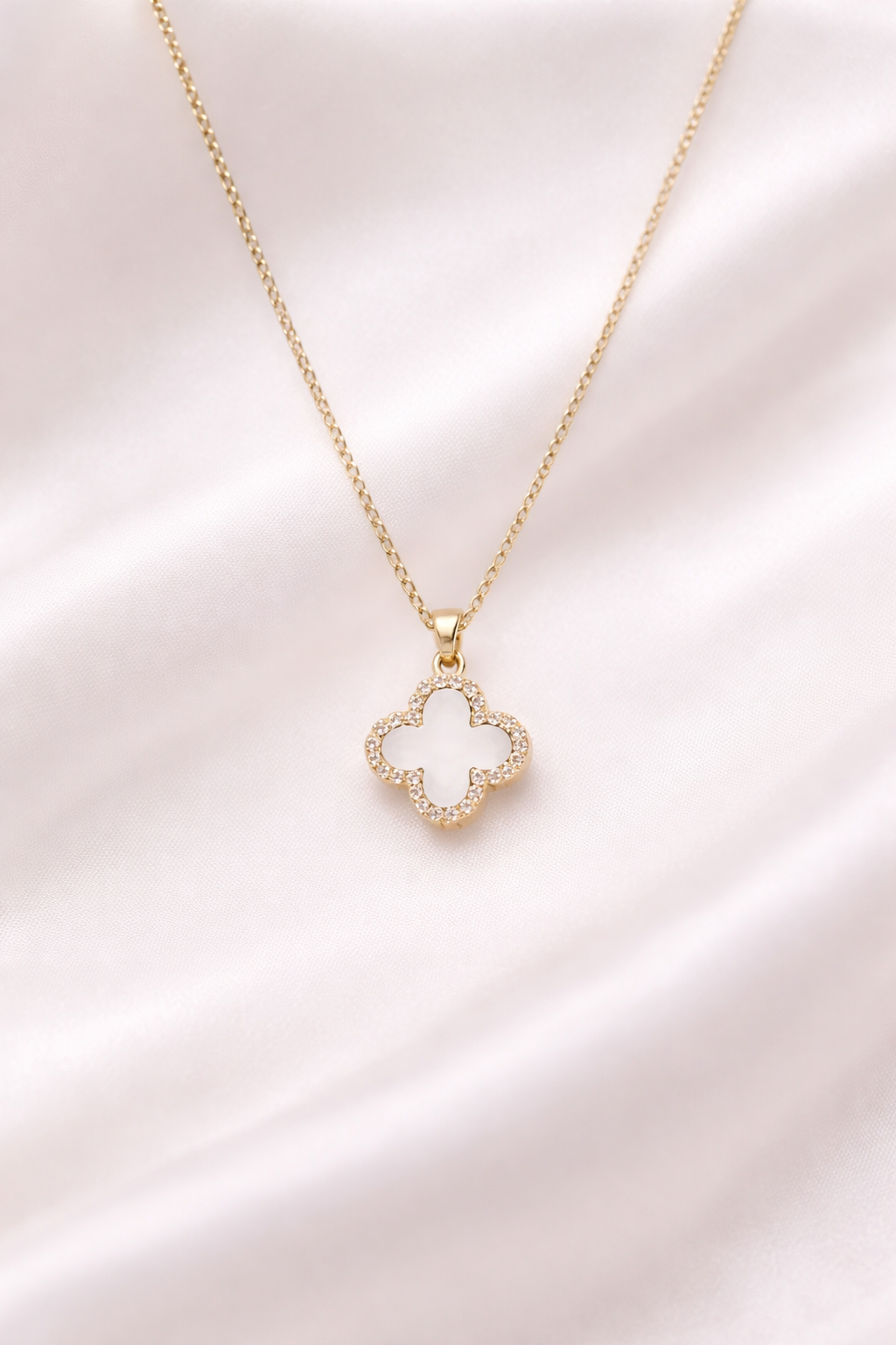 Add a touch of elegance to your everyday look with this beautiful white clover pendant. Featuring a smooth white center and delicate sparkling stones surrounding it, this pendant strikes the perfect balance between simplicity and luxury.